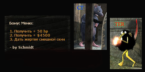 ![]() Описание скрипта:Террорист, установивший бомбу, получает случайный бонус: деньги, здоровье, скорость, частичную невидимость, длинные прыжки |